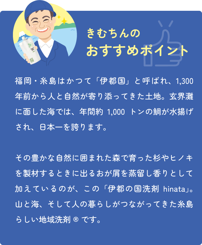 そこで「伊都の国洗剤hinataの普及が、糸島産の木材の普及に繋がるのなら・・・」との想いをもつ方達が現れ、その応援で、私どもの活動は、今も成り立っています。